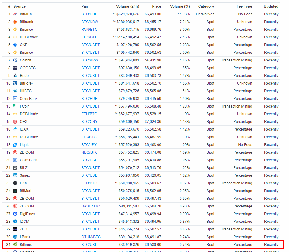 위 그림에서, 상위 순위에 빗썸 및 중국계 거래소들이 자리잡은 것을 확인할 수 있습니다. 그러나 이러한 거래소들은 '거래량 조작'으로 높은 순위를 차지하는 것이므로 제외하였습니다. 비트파이넥스 (Bitfinex)는 비록 거래량이 31위이긴 하지만 세력들의 놀이터로 많은 거래소 차트의 기준이 되는 거래소입니다. 따라서 많은 트레이더들이 비트파이넥스 차트를 기준으로 분석하고 있습니다. 비트맥스(Bitmex)의 경우에는 하락장에 유저수가 급증하면서 거래량이 1위를 차지하게 되었습니다. 비록 현물거래소가 아니지만 非테더 계열의 거래소중에 거래량이 압도적으로 많은 거래소이죠.