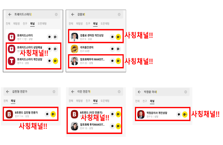 [안내] 트레이드스터디 사칭 업체 주의 안내 안녕하세요.트레이드스터디입니다. 최근 트레이드스터디 사칭업체 급증으로 인하여 업체 확인 문의가 오고 있습니다. 현재 트레이드스터디에서는 유선으로 연락드려 상품 안내 및 권유를 하고 있지 않사오니, 사칭업체에 피해가 없으시길 바라며, 현재 사칭 업체에 대하여 담당 법무팀에 확인 및 조치 진행중이며, 닉네임,결제내역에 언급이 있었던 통화내용에 대하여 녹음파일을 아래 플러스친구로 보내주시면 빠른 조치에 도움이 됩니다. 감사합니다. 사칭 업체 연락처 01076188938 01076514530 01080793919 01088451033 0269511677 01023953111 01024359146 01027215322 01090407964 01097396020 01075159172 01068049210 01026077542 01048925192 01055893630 01076649805 01079329658 ※해당 번호로 오는 연락은 대응하지마시고 바로 차단 부탁드립니다.